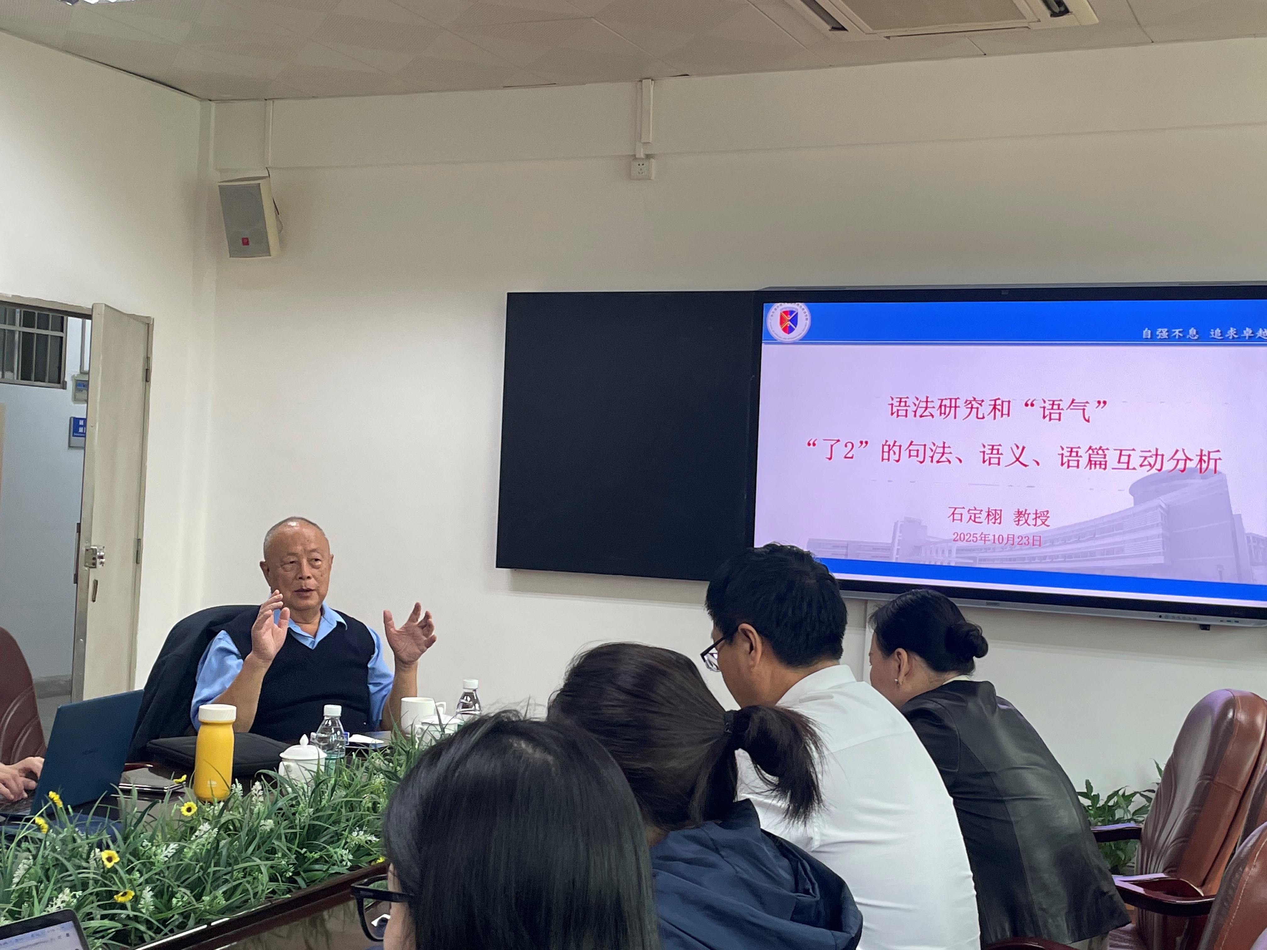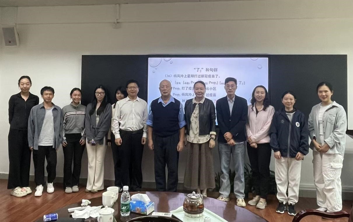 2025年10月23日15:00-17:00,著名语言学家、云山领军学者石定栩教授在第三教学楼318会议室,为我们师生带来了关于 “了2”的句法、语义、语篇互动分析的精彩分享。商英学院院长胡春雨、副院长陈潇潇、教师代表及硕博研究生到场聆听参与。